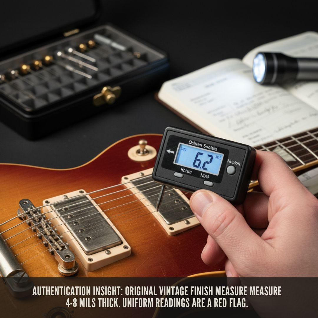 Authentication Insight: Professional authenticators use electronic paint thickness gauges. Original vintage finishes measure 4-8 mils thick, while modern refinishes often measure 2-4 mils (too thin) or 10+ mils (too thick).