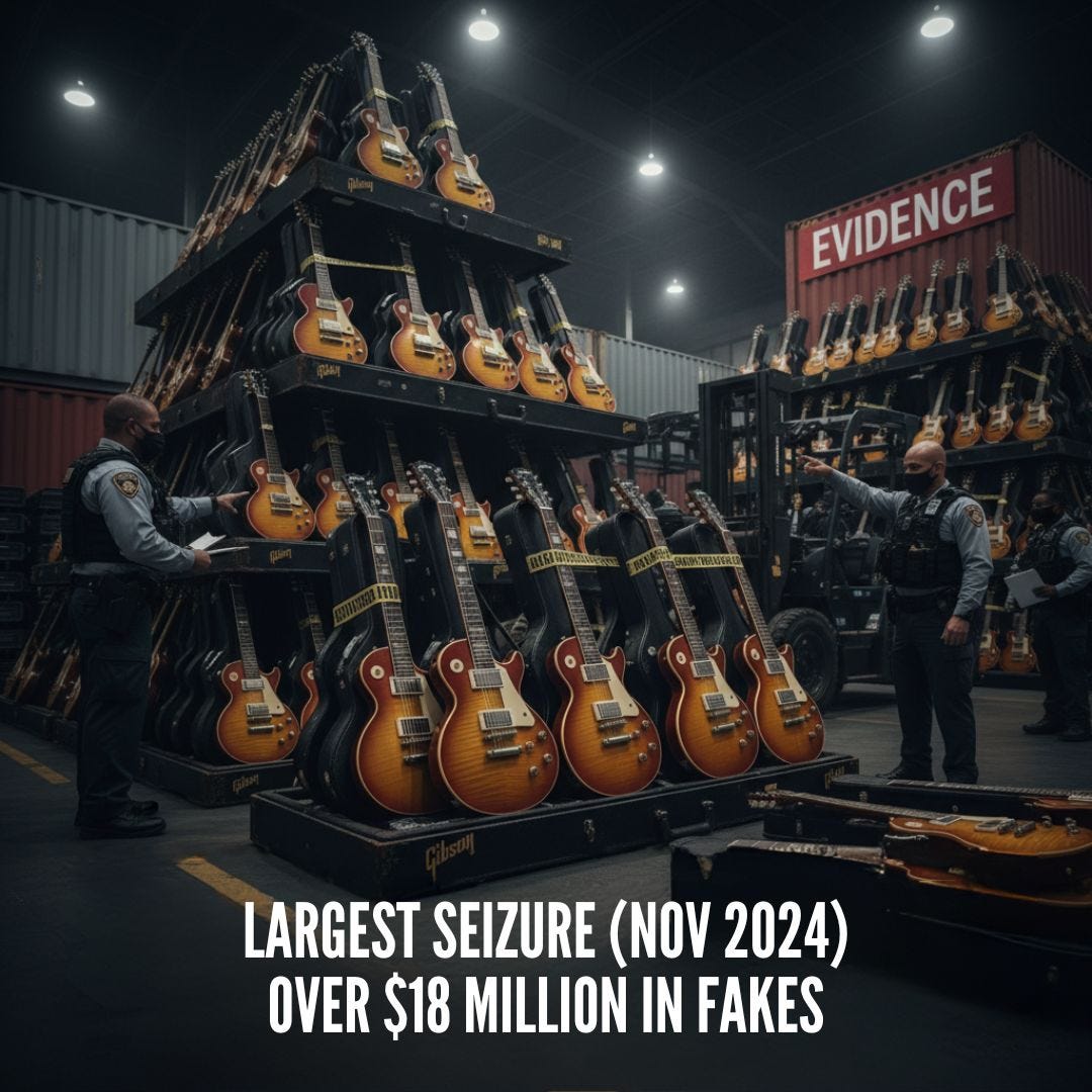 In 2024, experts estimate that over 70% of signed guitar authentication requests revealed forgeries, costing collectors millions in worthless purchases[1]. Last November, U.S. law enforcement seized 3,000 counterfeit Gibson guitars valued at more than $18 million at Long Beach Seaport—the largest seizure of counterfeit musical instruments to date.